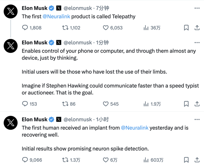 1月30日,马斯克在旗下社交平台X(前推特)上宣布,昨天首位人类接受了Neuralink的植入,目前恢复良好。初步结果显示,神经元尖峰检测很有希望。