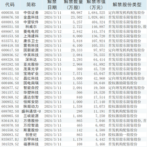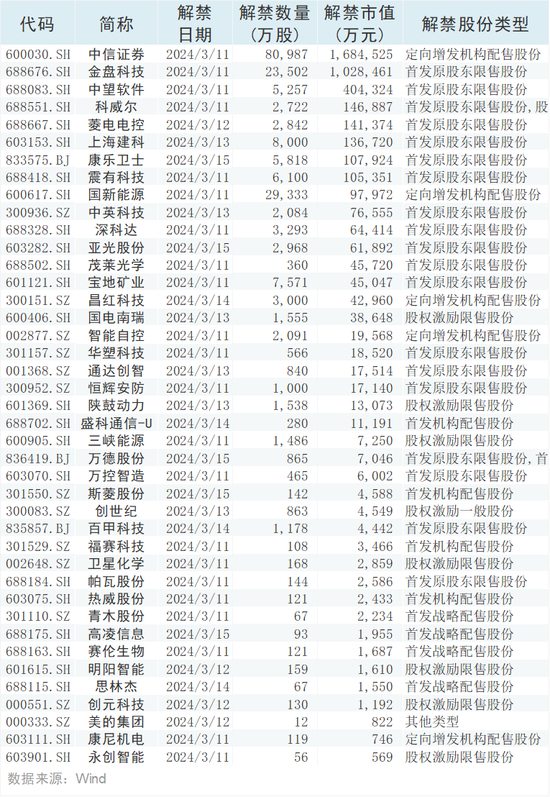 Wind数据统计显示,本周(3月11日-3月15日)共有41家公司限售股陆续解禁,合计解禁19.81亿股,按3月8日收盘价计算,解禁总市值为438.34亿元。