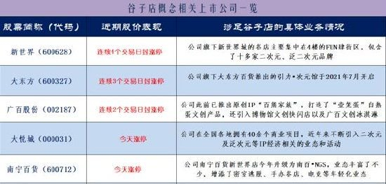 从今天的盘面来看,谷子经济概念股的行情走势方向或锚定在“谷子店”这一核心方向。值得关注的是,周四涨停的新世界(600628)、广百股份(002187)、大东方(600327)、大悦城(000031)、南宁百货(600712)均为“谷子店”相关概念股。