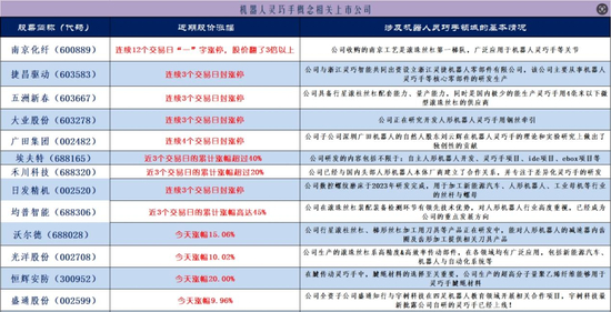 捷昌驱动(603583)与浙江灵巧智能共同出资设立浙江灵捷机器人零部件有限公司,该公司主要从事机器人灵巧手等核心零部件的研发生产,其股价在近3个交易日连续涨停;五洲新春(603667)具备行星滚柱丝杠配套能力、量产能力,同时是国内极少的能生产灵巧手用4毫米以下微型滚珠丝杠的供应商,其股价连续3个交易日封涨停;大业股份(603278)正在研究开发人形机器人灵巧手用钢丝牵引,其股价连续3个交易日涨停;日发精机(002520)的数控螺纹磨床于2023年研发完成,用于加工新能源汽车、人形机器人等行业的丝杆与螺母,其股价也是连续3个交易日封涨停;股价连续4个交易日封涨停的广田集团(002482),其子公司深圳广田机器人的自然人股东刘云辉在机器人灵巧手的理论和实验研究上做出了独创性的贡献。