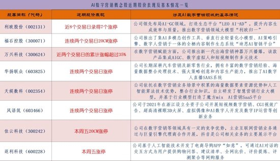 摘要:近日AI应用方面各种事件催化不断,一方面,OpenAI在人工智能领域所带来的这一系列重大突破,首当其冲将对广告营销这个领域产生历史性的巨大变革,有了OpenAI这个人工智能巨头的加持,AI数字营销概念或成为AI应用整个板块中的领涨龙头地位;另一方面,更关键的在于美股数字营销公司AppLovin股价年内暴涨900%对A股市场上的AI数字营销概念股给出示范效应!由此,AI数字营销概念作为AI应用板块的主线龙头地位已经确立,下周AI数字营销概念将继续扮演AI应用整个板块的领涨角色。在AI数字营销概念股于本周五全线启动的背景下,哪些上市公司还涉足AI数字营销呢?