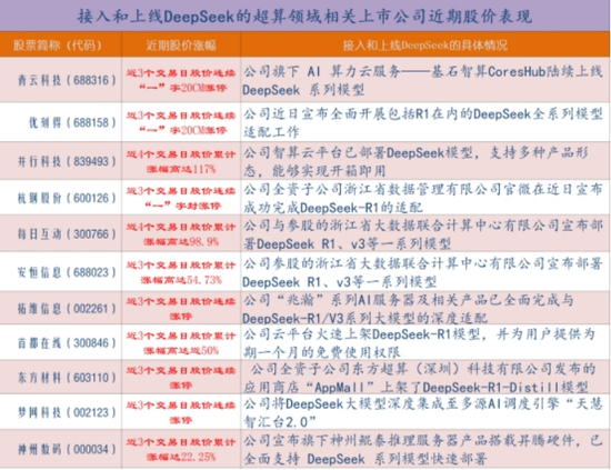 因此,在这样的市场乐观预期下,A股市场上近期宣布接入和上线DeepSeek的超算领域的相关上市公司,股价纷纷得到爆炒!