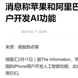 2 月 11 日,外媒《The Information》报道,苹果将与阿里巴巴合作,为中国的 iPhone 用户开发 AI 功能。