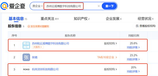 公开资料显示,海陆重工投资参股的苏州和云观博数字科技有限公司,与灵伴科技合资成立了苏州云观博数字科技有限公司。从股权穿透图我们可以看到,杭州灵伴科技有限公司与苏州和云观博数字科技有限公司合资成立了苏州云观博数字科技有限公司。其中,杭州灵伴科技有限公司与苏州和云观博数字科技有限公司的持股比例分别为20%和25.6%。根据持股比例,苏州和云观博数字科技有限公司和杭州灵伴科技有限公司分别为苏州云观博数字科技有限公司的第一和第三大股东。