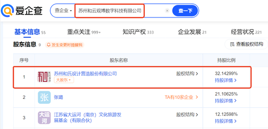 苏州和云观博数字科技有限公司的第一大股东是苏州和氏设计营造股份有限公司,持股比例为32.14%。