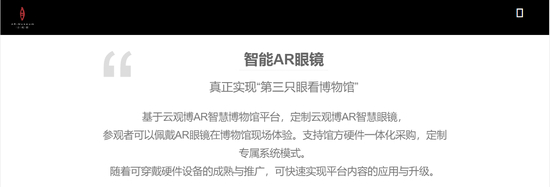 据云观博公司的官网介绍,基于云观博AR/AI智慧博物馆平台,定制云观博AR/AI智慧眼镜,参观者可以佩戴AR/AI眼镜在博物馆现场体验。支持馆方硬件一体化采购,定制专属系统模式。随着可穿戴硬件设备的成熟与推广,可快速实现平台内容的应用与升级。