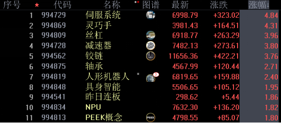 机器人概念股近期迎来重要催化事件:机器人板块在周二进入爆发阶段,从而成为当前整个市场热点风口。周二A股市场盘面上最突出的特征就是近日不断走强的机器人概念终于进入大爆发阶段,并且成功压倒近段时间一来一时风头无两的商业航天概念,从而成为当前整个市场最火爆的热点风口!从今天收盘的情况来看,涨幅排名前10的板块中,几乎清一色的均为机器人/具身智能产业链相关板块: