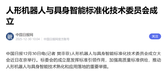 据介绍,成立人形机器人与具身智能标准化技术委员会是贯彻落实中央决策部署,发挥标准引领作用,加强高质量标准供给,推动人形机器人与具身智能技术熟化和应用落地的重要举措。标委会主要承担人形机器人与具身智能基础共性、关键技术、部组件、整机与系统、应用、安全等领域行业标准制修订工作。
