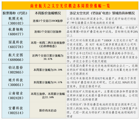 以下是商业航天之太空光伏概念相关品种本周股价的涨幅情况: