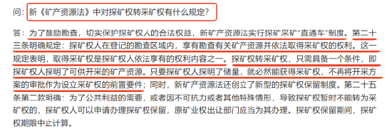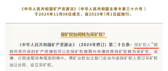 值得注意的是,自2025年7月1日起,新《矿产资源法》已经开始实施,探转采直通车制度已经落地,《中华人民共和国矿产资源法》(2024年修订)第二十五条:探矿权人探明可供开采的矿产资源后可以在探矿权期限内申请将其探矿权转为采矿权。换句话说,新《矿产资源法》给公司这样的资源型企业带来的最大红利就是——只要探矿权人探明了储量,就必然能获得采矿权。