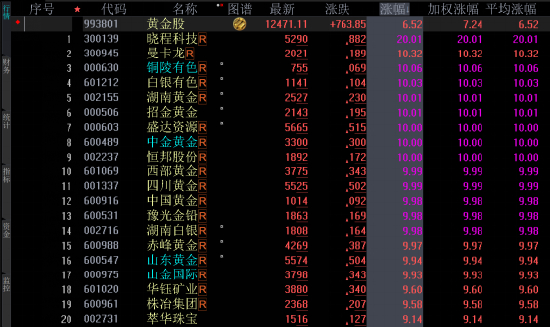 从个股的涨幅榜来看,截止周一收盘,四川黄金(001337)、湖南黄金(002155)、中国黄金(600916)、中金黄金(600489)、招金黄金(000506)、恒邦股份(002237)、西部黄金(601069)、盛达资源(000603)、威领股份(002667)、白银有色(601212)、豫光金铅(600531)、湖南白银(002716)、西部矿业(601168)、铜陵有色(000630)、晓程科技(300139)、兴业银锡(000426)、福达合金(603045)等多只黄金股的股价以涨停价报收。