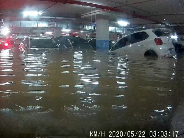 5月22日凌晨,雨势过大,地下车库进水,停在车库里的大量车辆被淹。图片来源 受访者供图