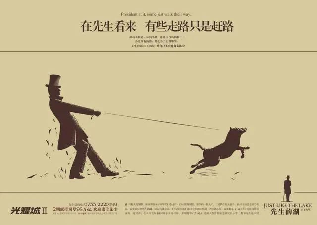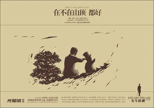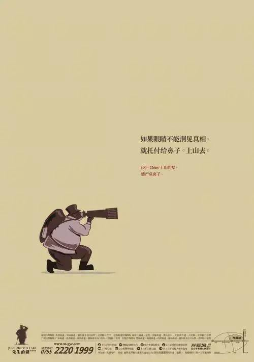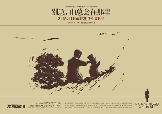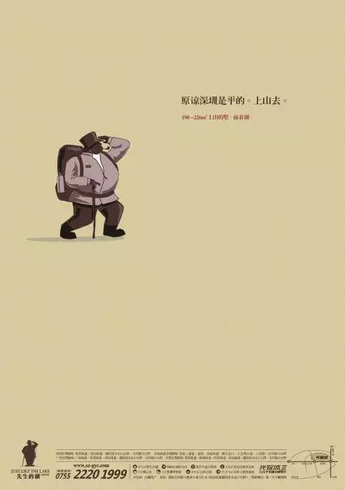后来,这个项目又推出了新产品,别墅更大了,而且搬到了山上,广告公司的脑洞让人又惊又喜:面积变大了,就是先生发福了,别墅到山上了,就是上山的墅了。