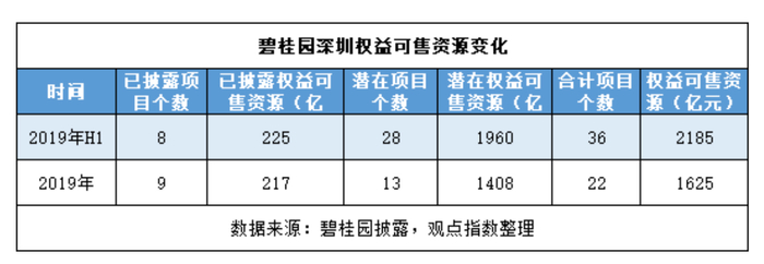 投资者向观点提产提供的碧桂园业绩报告显示,截止2019年底,碧桂园在深圳已披露权益项目个数为9个,较半年前增加1个,对应权益可售资源却减少至217亿元;潜在项目13个,较半年前减少15个,潜在权益可售资源降28%至1408亿元;合计项目个数22个,总体减少14个,总权益可售资源降25.6%至1625亿元。
