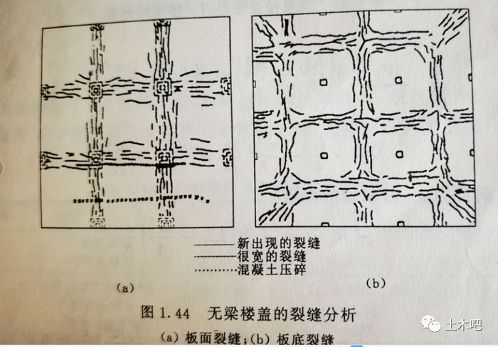 从无梁楼板结构的破坏模式及破坏机理分析一下,以下来自混凝土教科书,此模式应是截面设计及配筋均比较合理的情况下。在均布荷载作用下,无梁楼盖在开裂前基本处于弹性工作阶段。随着荷载增加,在柱帽顶面出现裂缝,继续加载,在柱帽顶面边缘板上出现沿柱列轴线的裂缝,随着荷载增加,板顶裂缝继续不断发展,进而在板底l/3跨中出现板底裂缝。即将破坏时,板顶及板底裂缝均出现特别大的主裂缝。受拉钢筋屈服,受压混凝土达到极限压应变。