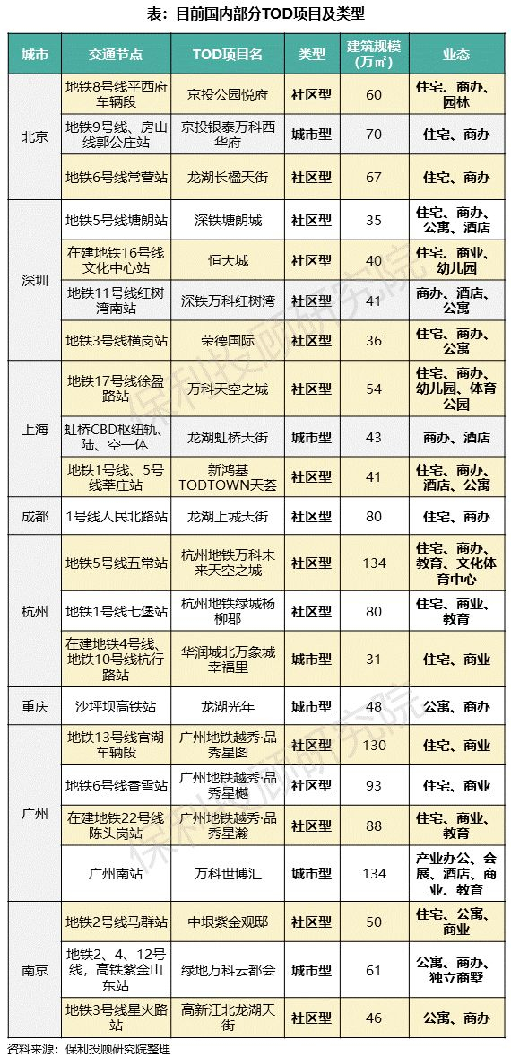 目前国内已有的TOD项目,多为社区型TOD,主要有两个特征:①多位于城市近郊,为地铁车辆段上盖项目;②业态主要包括住宅、商业、教育等,基本生活配套齐全。