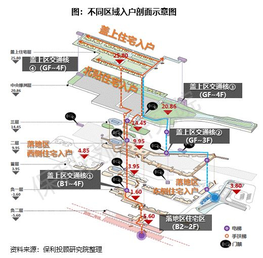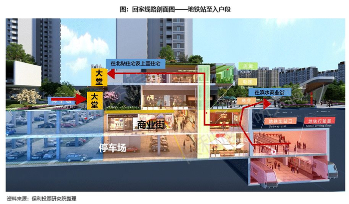 ①通过打造地铁内部与社区联通的四大交通核,将交通层、居住层、商业层、公共空间层相连通,形成完整的社区动线。