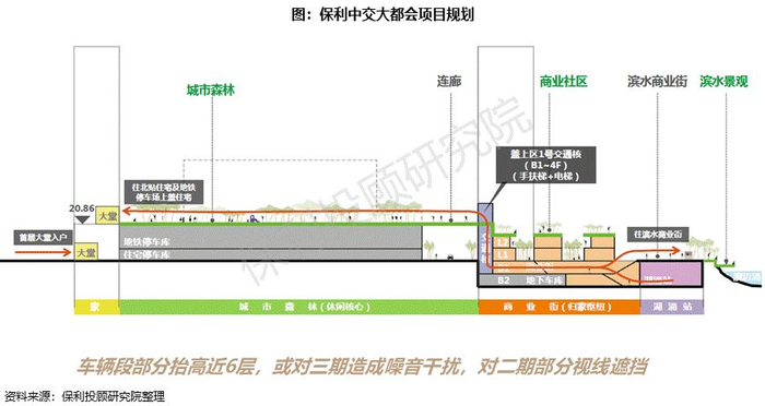 从项目立体剖面看,三个项目实际仅为地铁车辆段上盖商住项目,并没有完整立体交通系统。