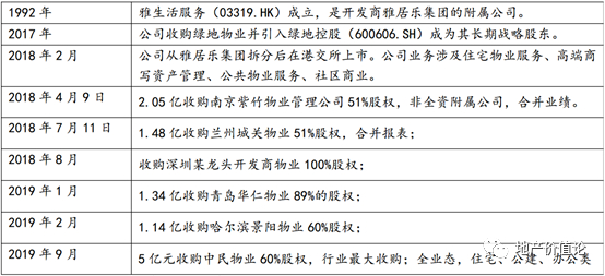并购,是雅生活扩张的最大手段,是并购让雅生活拿下了绿地物业和中民物业,也拿下了和绿地控股的战略合作。上市以来,雅生活在2017/2018/2019均有较大的并购动作。