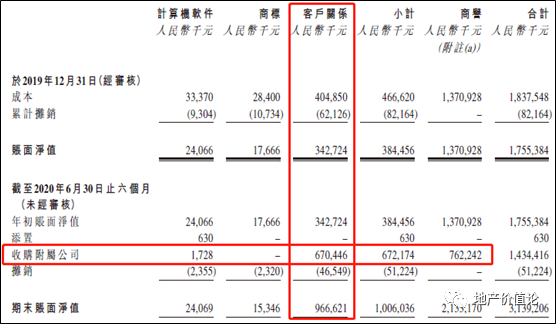 收购中民物业,增厚了雅生活的业务规模,但同时也在账面新增了巨额的无形资产及商誉。截止今年上半年,雅生活的无形资产中,最重的一块是客户关系,达到9.67亿元,其中中民物业今年并表就贡献了6.7亿元。