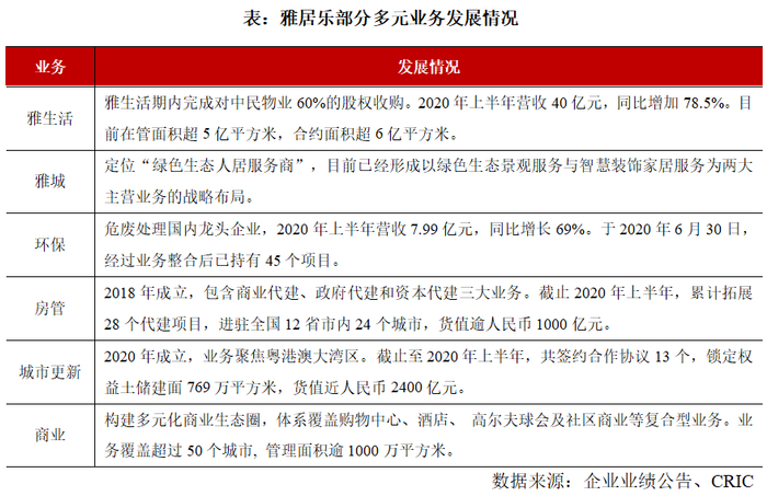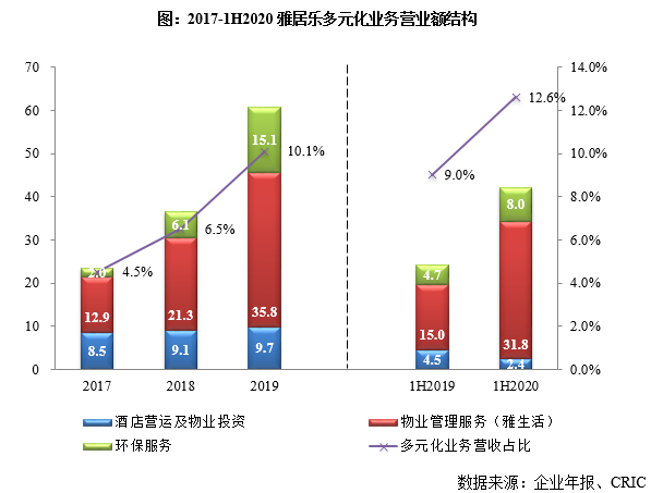 在不断探索多元化业务发展路径上,雅居乐形成了地产、雅生活、环保、雅城、房管、资本、商业、城市更新等几大产业集团并行运营的格局,且多元营收占比逐年上升。今年上半年,雅居乐多元化业务营收占比增长至12.6%,同比增加3.6个百分点。