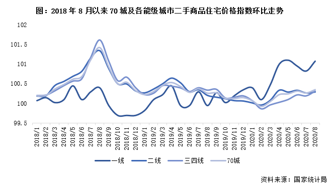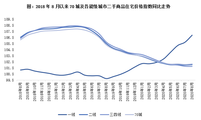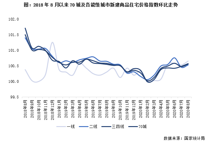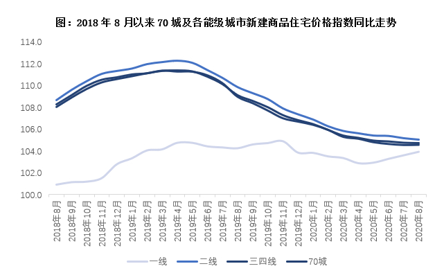 全国商品住宅销售价格遵循“房住不炒”主线,整体稳中趋落。从国家统计局发布的70个大中城市新建商品住宅销售价格变动情况可以看到,截至2020年8月底,一线城市新建商品住宅和二手住宅销售价格同比涨幅有所扩大,二三线城市同环比涨幅持续收窄。具体来看,新房价格同比一线上涨3.9%,增幅扩大0.3pts,二线上涨5.0%,三四线上涨4.5%,涨幅均收窄0.2pts。各省市充分发挥主体责任,确保了疫情期间城市销售价格未出现大涨大跌的现象。新房环比方面,整体呈小幅波动,各能级房价与上月大体持平,环比涨幅变动来看,一线、三四线分别上扬0.1pts和0.3pts,二线则收窄0.3pts。整体来看,全国各能级城市房价稳中有落的趋势延续。