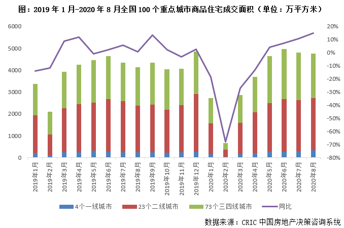 回顾2020年前三季度,开局很“难”,年初受新冠疫情的影响,2月的“断崖式”下跌后,购房需求迎来了一波集中释放期,3月开始攀升、5月同比转增、6月年内新高,7-8月淡季“不淡”,前8月累计跌幅收窄至7%,虽然9月成交略有回调,但同比依旧保持增势,市场惯性延续。