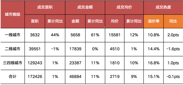 就前三季度总体情况来看,尽管第三季度二、三线城市地价均呈现环比下降趋势,但由于第二季度市场热度整体处于高位,各能级城市在前三季度总成交均价同比均呈上涨趋势,涨幅分别为12%、1%和10%;另外,受一线城市超高价优质地块成交带动的影响,整体成交均价同比涨幅升至9%。