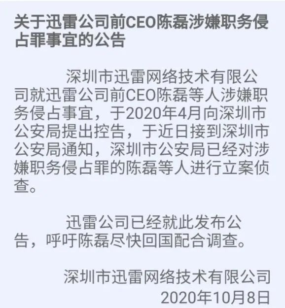 公告中说:迅雷公司前CEO陈磊等人涉嫌职务侵占事宜,于2020年4月向深圳市公安局提出控告,于近日接到深圳市公安局通知,深圳市公安局已经对涉嫌职务侵占罪的陈磊等人进行立案侦查。
