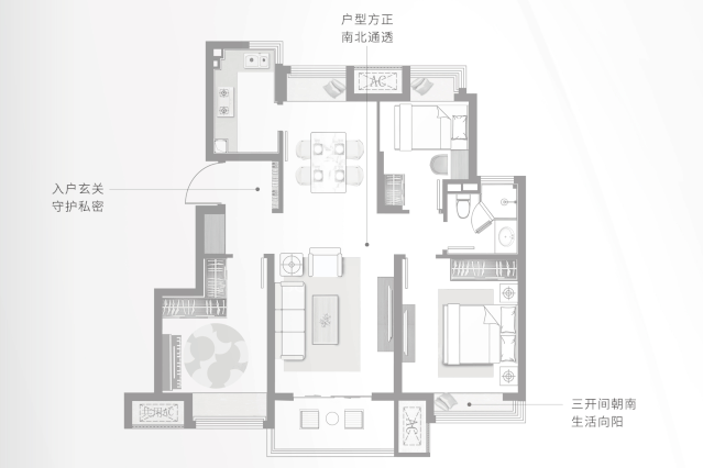 123㎡三户进阶户型,四开间朝南+南北通透,南北双阳台无缝对接6.2米横厅。