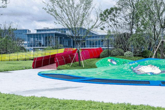 0-3岁幼儿活动区,采用特色地面铺装,并定制看护座椅、转转椅、摇摇马等,其他区域,则设有mini足球场、滑板坡道、环形彩色跑步道、骑行道、无边界泳池、滑梯等。