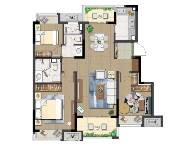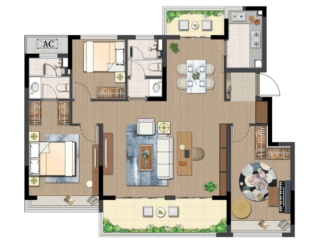 南北双阳台的好处显而易见,南向阳台能满足人们对于浪漫生活的更多想象,北向阳台则满足晾晒收纳等居家功能。