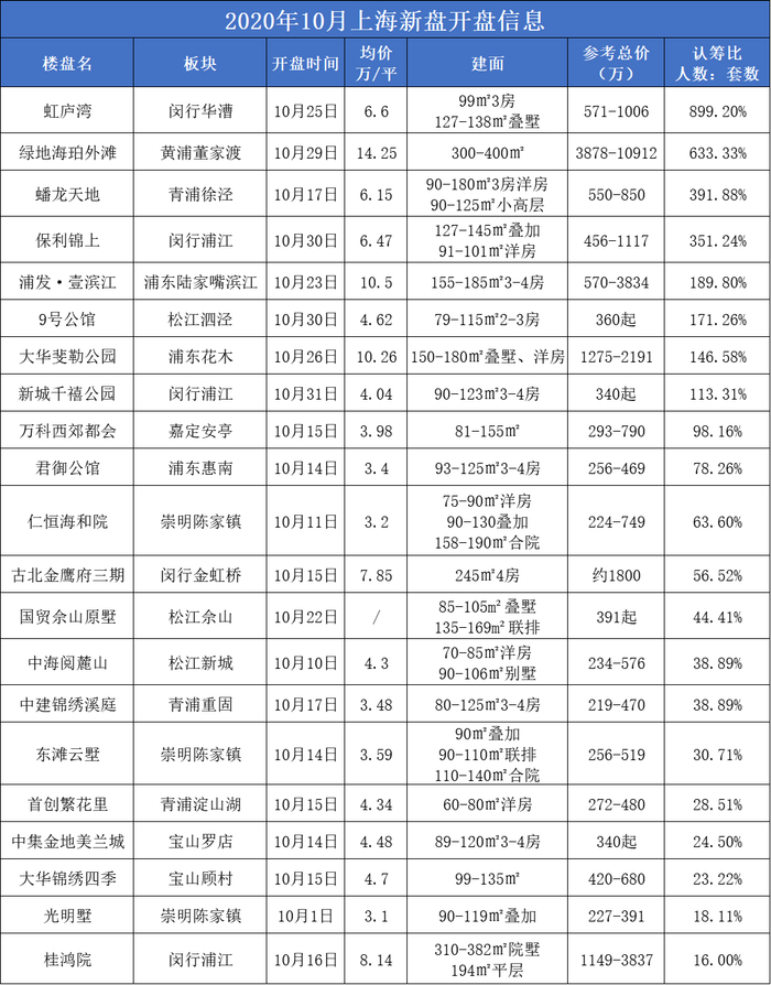10月,新房市场全市成交面积达95.7万平方米,环比同比增加了77.9%,更出现了不少“爆款产品”。虹庐湾认筹率899.2%,9人抢1房;蟠龙天地吸引了3715组认筹,打破了上海市场维持了两年半的新盘认筹记录。