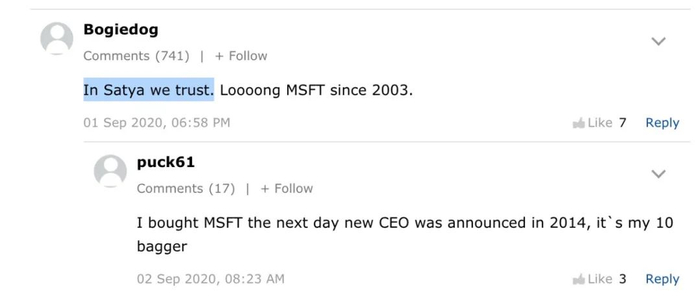 如果你常上美国的投资论坛,比如Seeking Alpha,你会感觉纳德拉已经成了投资者心中的神(比如下面的这句In Satya we trust),很多投资者的感觉是只要他还在任,微软的未来就会更好,微软的股票也会继续涨。