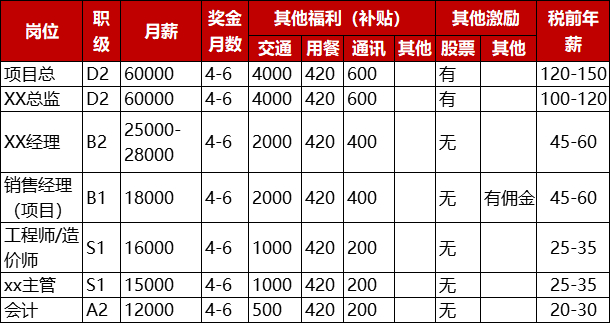 该房企比较港资风,所以薪酬设置跟港企非常像,基本就是给个打包月薪,也没有补贴,月数也非常固定。