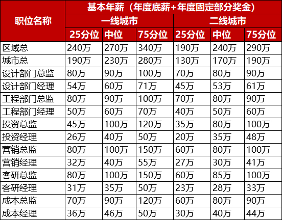 再加上薪酬体系与职级体系又是强关联,但是每家的职级体系都不一定能对应,部分头部房企的城市总放到其他房企甚至都能直接做总裁,薪酬自然而然也很难对等。
