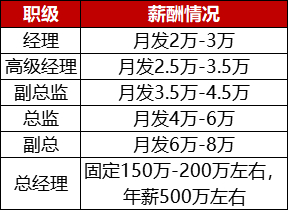 从经理级别开始看,基本月发敲死在税前2万-3.5万,并且通常来说都是在税前2万-3万,只有极个别聊得特别好的,才有可能给你放宽到税前3.5万。