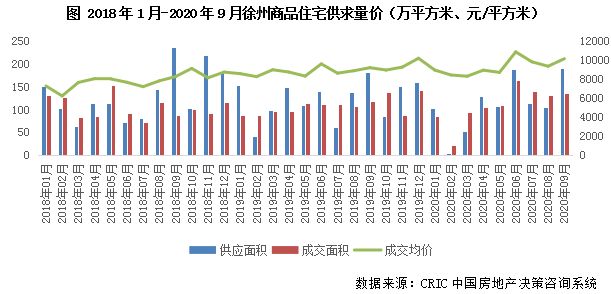 2020年疫情期间,徐州房地产市场近乎停摆,多项目案场停售,2月成交骤降至22万平方米历史低位。不过,3月以来徐州市场强劲复苏,成交迅速回升,同比跌幅大幅收窄,并在4月率先实现同比转正。6月,受惠于房企加紧推售、抢收半年度业绩,成交面积进一步提升至162万平方米,并创近年来单月新高。三季度,徐州市场热度不减,成交持续高位运行。1-9月,徐州商品住宅累计成交981万平方米,同比增长6%,乃是为数不多的成交同比实现正增长的三四线城市。