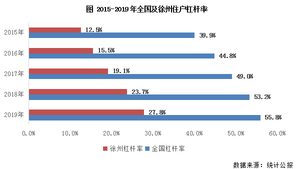 近年来,徐州本地居民加杠杆购房,住户杠杆率持续提升。2015年-2019年,徐州住户贷款余额由668亿元提升至1991亿元,净增长近2倍,杠杆率则由12.5%提升至27.8%,净增长15.3个百分点。