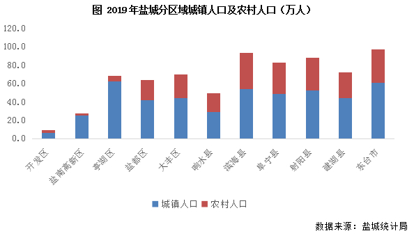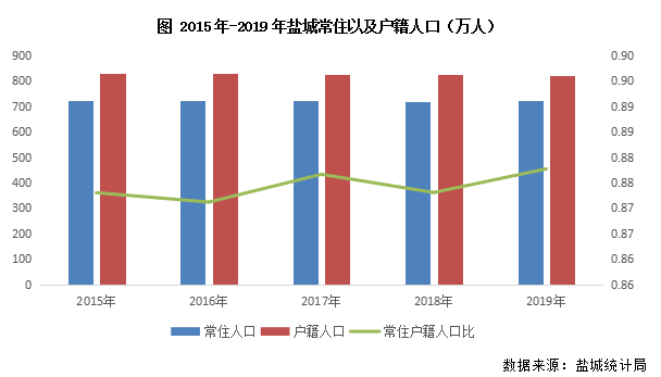 盐城乃是传统的人口输出型城市,多达百万计本地居民长期外出务工,历年常住户籍人口比均低于0.9。2019年,盐城常住人口720.9万人,户籍人口821.4万人,净流出100.5万人。