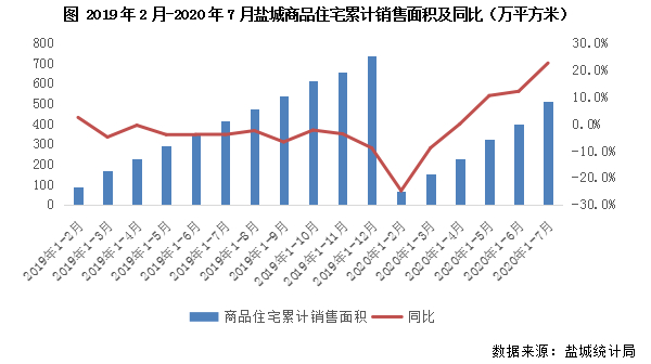 受疫情影响,2020年春节假期盐城返乡置业潮失约,成交大幅回落,首2月商品住宅销售面积跌至66万平方米,同比下降25%。不过,疫后盐城楼市强劲复苏,3月成交已同比转正,并连续数月高位运行。7月市场淡季不淡,商品住宅销售面积跃升至113万平方米,创近年来单月新高。1-7月,商品住宅累计成交508万平方米,同比增长23%。