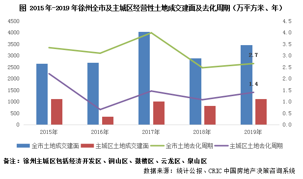分区域来看,徐州远郊区县供地显著超量,但市场需求增长受限,长期去化风险仍需警惕。主城区则有序供地,叠加市场需求相对坚挺,长期去化压力整体可控。2019年,徐州主城区经营性土地成交1113万平方米,占据全市的成交比重达32%,土地去化周期约1.4年。