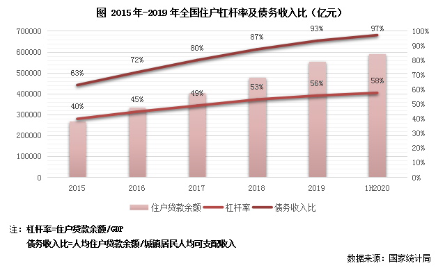 这与居民加杠杆购房密不可分。2020年上半年,全国住户杠杆率升至57.7%,较2019年净增长1.9个百分点。居民偿债能力进一步减弱,上半年全国债务收入比升至97.1%,较2019年净增长3.8个百分点。