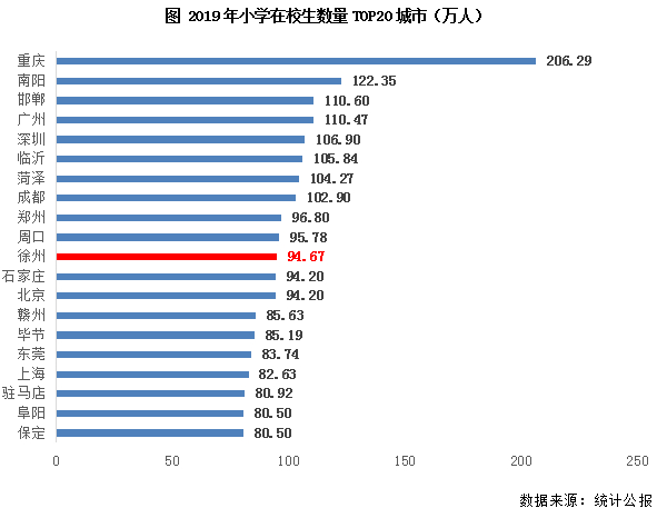 徐州乃是传统的人口大市,叠加新婚适育家庭生育意愿较高,年均户籍出生人口都在15万人左右,致使小学在校生数量稳居全国前列。2019年,徐州小学在校生多达94.67万人,暂列全国第11名,占全市常住人口的比重约10.7%。