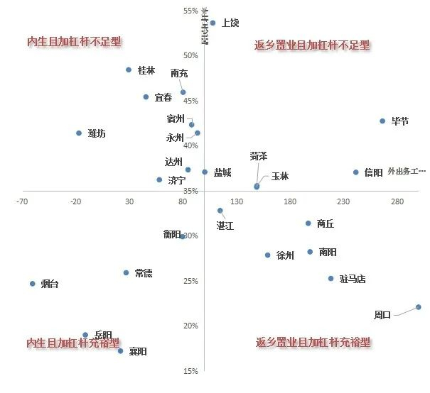 为了更进一步探究25个内生型三四线城市的楼市特征,我们依照外出务工人口规模和住户杠杆率将其分为四大类型:内生且加杠杆充裕型、内生且加杠杆不足型、返乡且加杠杆充裕型、返乡且加杠杆不足型。