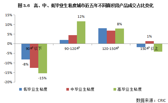 1)高毕业生粘度城市90-150平方米户型产品占比增长更为显著,其中90-120平方米产品占比增长更为显著,增加了12个百分点,稍大的120-150平方米产品占比增加了8个百分点。之所以会呈现这种趋势,主要是由于高毕业生粘度城市一般房价水平较高,购房难度较大,譬如深圳房价收入比超25年以上,在同样价格的产品上,面积段相对小、总价相对较低的产品成交占比增幅更大。同样受购买力所限,150平方米以上的豪宅产品成交占比降幅在三类城市中最突出。