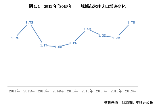 在上述因素的影响下,全国流动人口规模在2014年达到高位后开始回落,一二线城市的常住人口增长速度在此之前也出现了下滑趋势。从2011年~2019年一二线常住人口增速变化来看,在2012年后的三年间,一二线城市的人口增长速度下滑至1.1%左右,是近年来的最低水平。