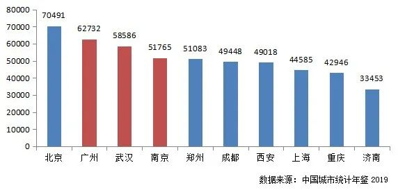 在校大学生占比超过10%的城市仅有4个,包括兰州、南昌、太原和郑州。其中,常住人口规模仅有300多万人的兰州,拥有兰州大学在内的多所高等院校,是西北地区除西安外高校资源最丰富的城市,也招收了大量的学生,2019年在校大学生数量也超过了50万人,占常住人口的比例高达15%,位居一二线城市首位。而在校大学生数量超过百万的城市中,仅有郑州的比例刚刚超过10%,武汉、广州由于常住人口基数相对较大均未能达到10%以上。
