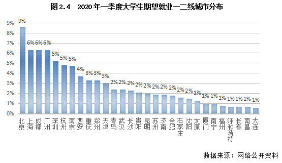 就2020年大学生期望就业城市来看,在主要一二线城市中,一线城市依然是大学生首选目标城市,其中北京、上海以绝对优势领跑一二线,成为2020年大学生最想就业的城市。值得关注的是,新一线城市表现也比较突出,特别是成都,更是超过广州和深圳,跻身大学生期望就业城市前三。