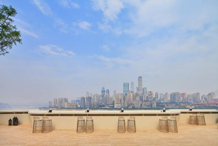重庆印长江距离长江直线距离仅37米,颇有创意的是重庆东原印长江的女儿墙设计,一个光滑桌面吧台瞬间呈现出无边际江景效果。